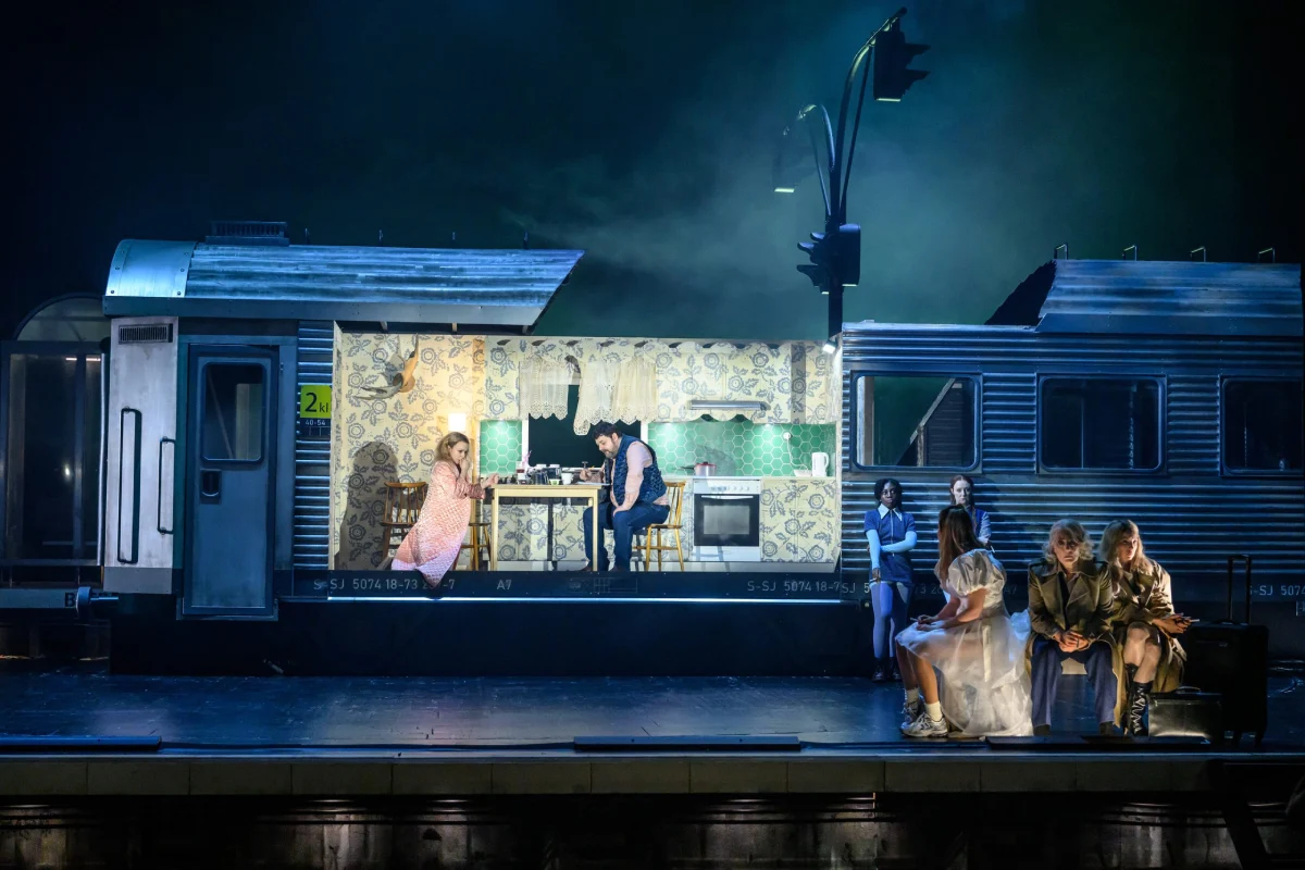 Till Dramatens stora scen tillverkades en spektakulär dekor bland annat i form av enorm teleskopisk tågvagn i full skala.